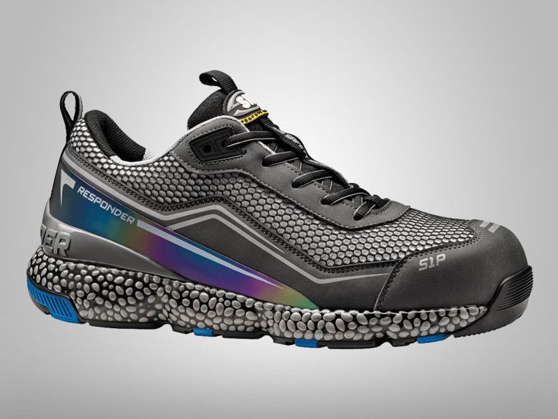 Bezpečnostní polobotka s ultradynamickým designem, s hliníkovou špičkou a kompozitní mezipodešví s konstantní tloušťkou 4 mm.