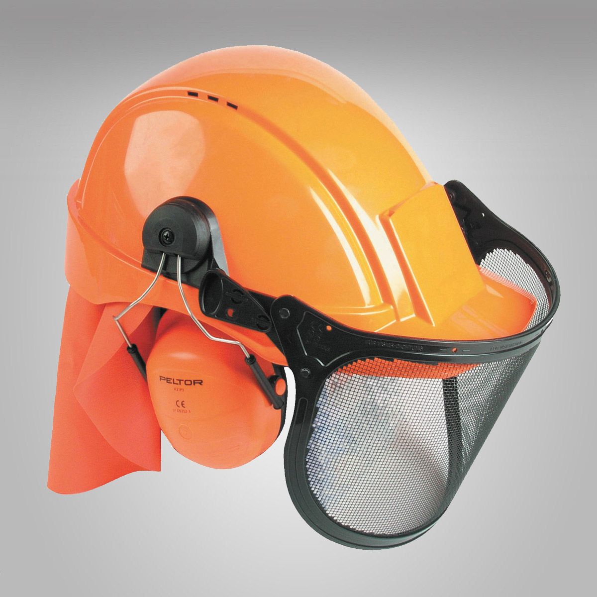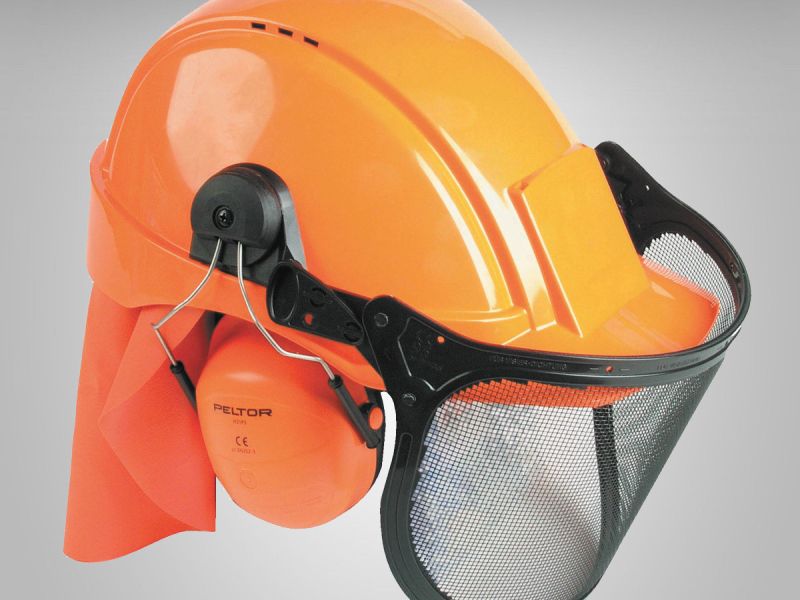 Lesnická sada skládající se z přilby Peltor G2000 a mušlového chrániče sluchu H31P3K s odklopnou drátěnou mřížkou a plachetkou na zátylku.