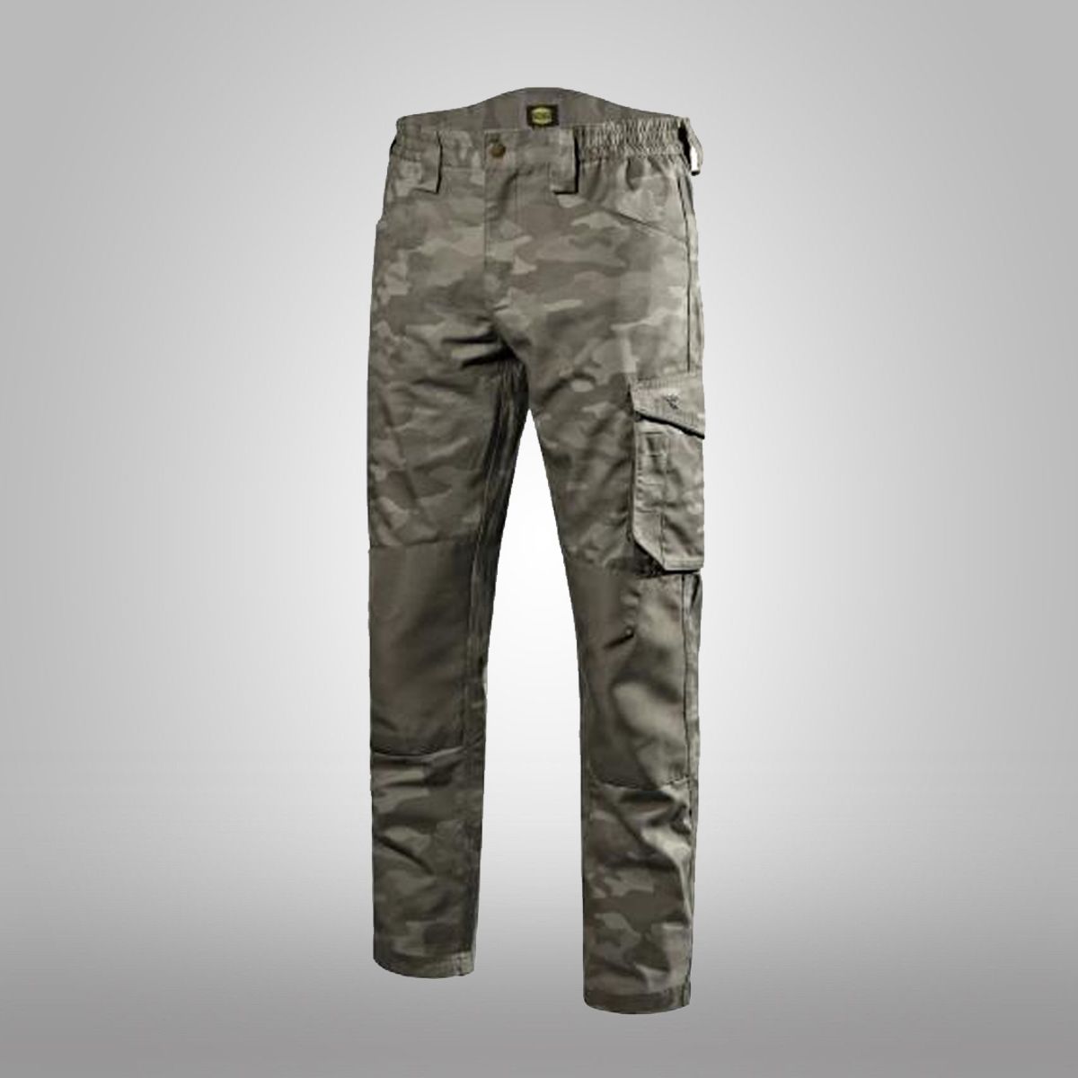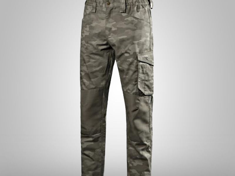 Cargo kalhoty s kamuflážovým vzorem, boční kapsy na nohavicích, reflexní doplňky, vyztužené kolena s možností vsunutí nákoleníků, elastický pas, trojité prošívání, materiál - Twill 65% polyester, 35% bavlna v gramáži 250g