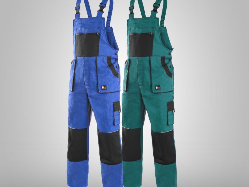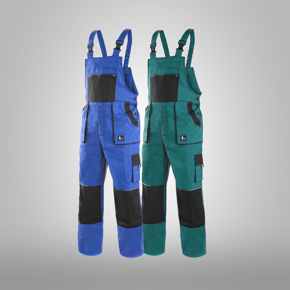 Pánské kalhoty s náprsenkou, zdvojená kolena, přední našité kapsy, náprsní kapsa na zip, boční kapsy na metr a na mobil, pas v zadní části do gumy.