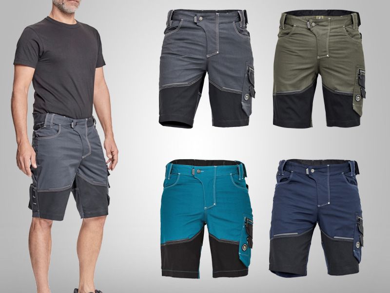 Pánské pracovní šortky, elastický inovativní materiál TRIFIBETEX®, slim střih, snížený pružný pas, odolné trojité prošití nohavic a sedu, prostorné multifunkční přední kapsy s poutky na nářadí, 2 zadní kapsy na suchý zip, stehenní kapsa na telefon s klopou a zapínáním na suchý zip, kapsa na metr a nůž, poutko na kladivo, "D" kroužek, poutko na nářadí v pase, originální zpracování zapínání kalhot, reflektivní prvky v barevném odstínu.