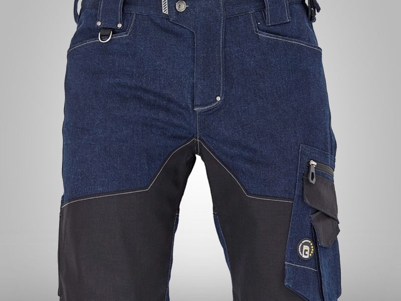Pánské pracovní šortky, elastická předepraná denim látka, slim střih, snížený pružný pas, odolné trojité prošití nohavic a sedu, CORDURA a TRIFIBETEX zesílená část stehen a sedu, prostorné multifunkční přední kapsy s poutky na nářadí, 2 zadní kapsy, stehenní kapsa na telefon s klopou a zapínáním na suchý zip, kapsa na metr a nůž, poutko na kladivo, "D" kroužek, poutko na nářadí v pase, originální zpracování zapínání kalhot.