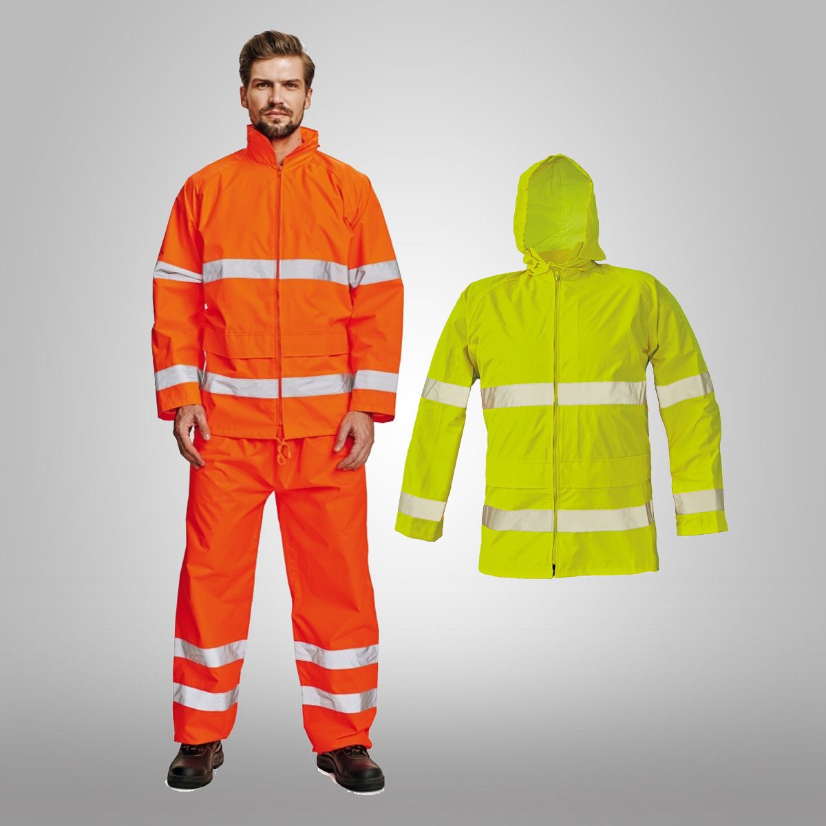 Výstražná Hi-Vis nepromokavá lehká bunda s kapucí a reflexními pruhy • integrovaná kapuce v límci • spodní lem ke stažení na tkaničku • odvětrávání bundy na zádech a v podpaží • podlepené švy