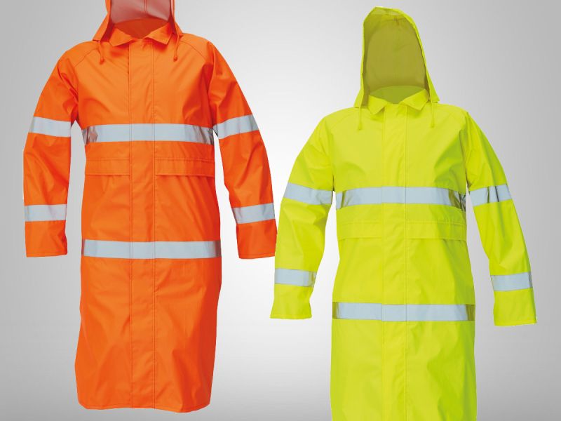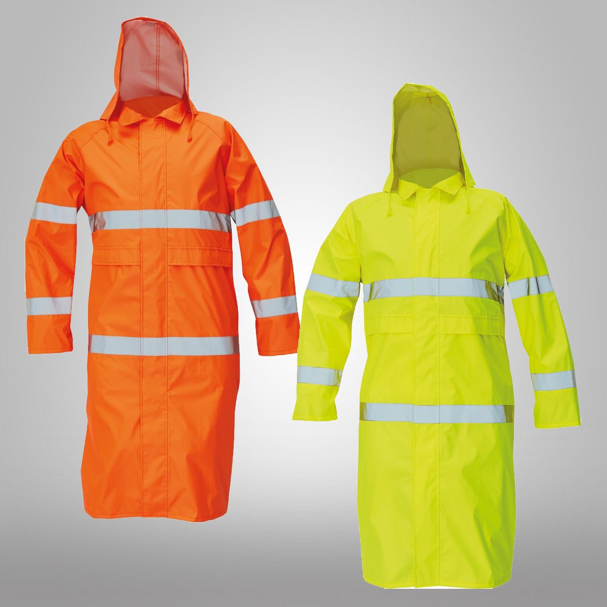 Výstražný hi-vis nepromokavý lehký plášt s kapucí a reflexními pruhy • intergrovaná kapuce v límci • odvětrávání na zádech a v podpaží • podlepené švy