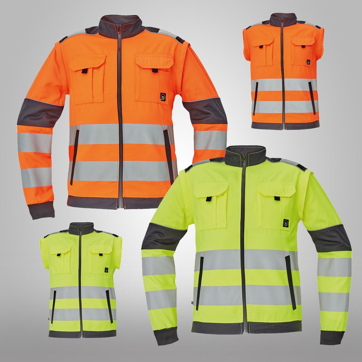 Pánská HI-VIS pracovní bunda se zapínáním na zip, odepínatelné rukávy, 2 přední kapsy, 2 náprsní kapsy, Oxford 600D zesílení namáhaných míst loktů a ramen, dvojice tištěných 7 cm reflexních pruhů přes obvod pasu a rukávů, 2 menší pruhy přes ramena, reflexní paspulky lemující zesílené části rukávů a ramen, pružné náplety manžet rukávů a elastický spodní obvod pasu.