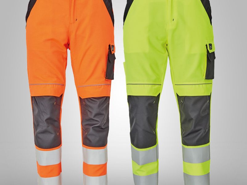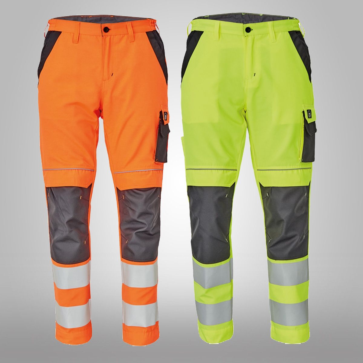 Pánské HI-VIS pracovní kalhoty s elastickým pasem, 2 přední kapsy, 1 levá zdvojená stehenní kapsa, 2 zadní kapsy, 2 menší zadní kapsičky na pravém stehnu, dvojice tištěných 7.5 cm reflexních pruhů na spodní části nohavic, reflexní paspulky, Oxford 600D zesílení kolen s možností horního vkládání nákoleníků, možnost prodloužení nohavic.