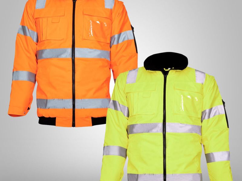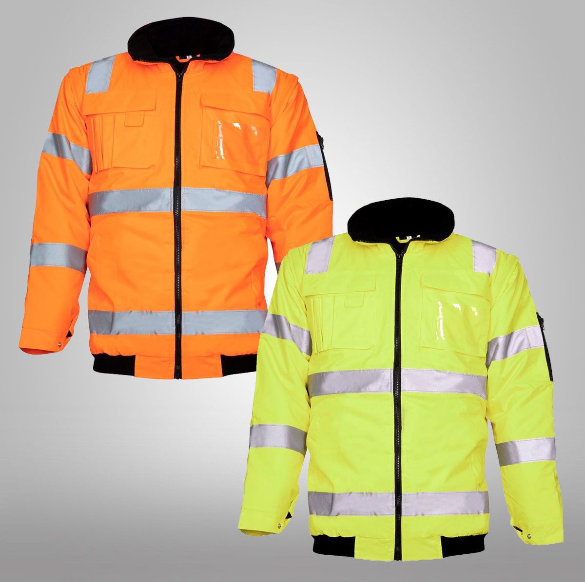 Výstražná nepromokavá bunda s reflexními prvky s kapucí, kterou lze schovat do límce a s odepínatelnými rukávy. 2 vodorovné a 2 svislé reflexní pásky na předním a zadním dílu, 2 reflexní pásky na rukávech a 2 reflexní pásky na ramenou. Přelepené švy, exponované části v černé barvě, zip krytý légou, stahovací manžeta na rukávech.