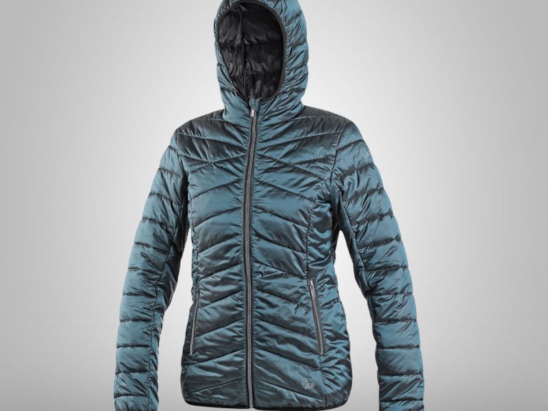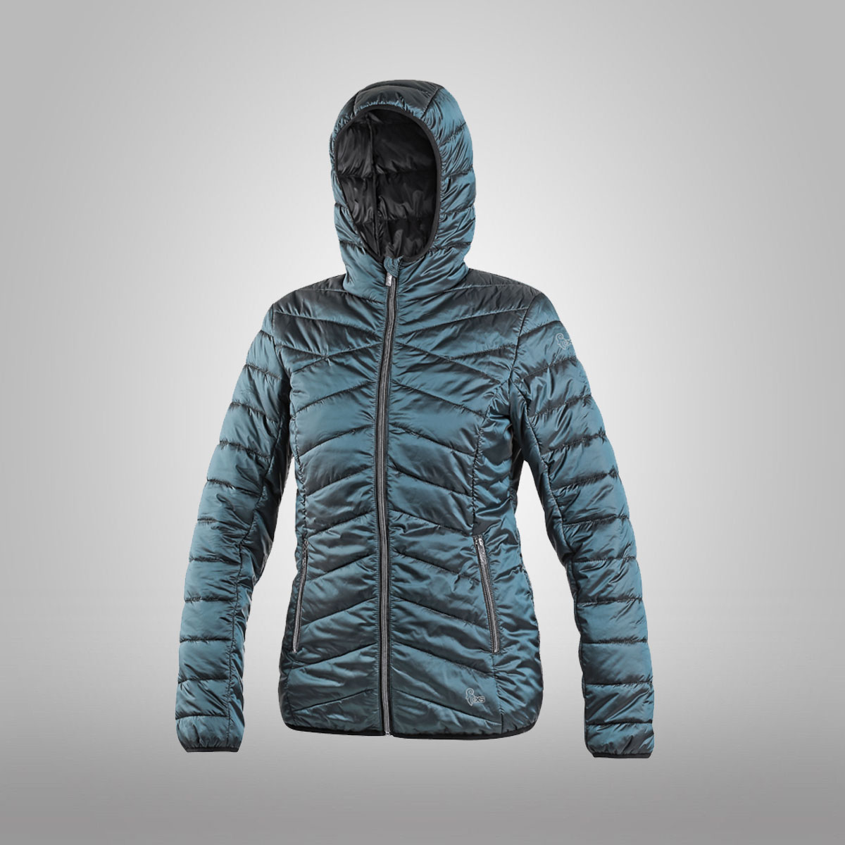 Dámská zateplená bunda s kapucí, hlavicové rukávy, manžety rukávu a délka bundy zakončeny gumičkou, 2 spodní kapsy na zip.
