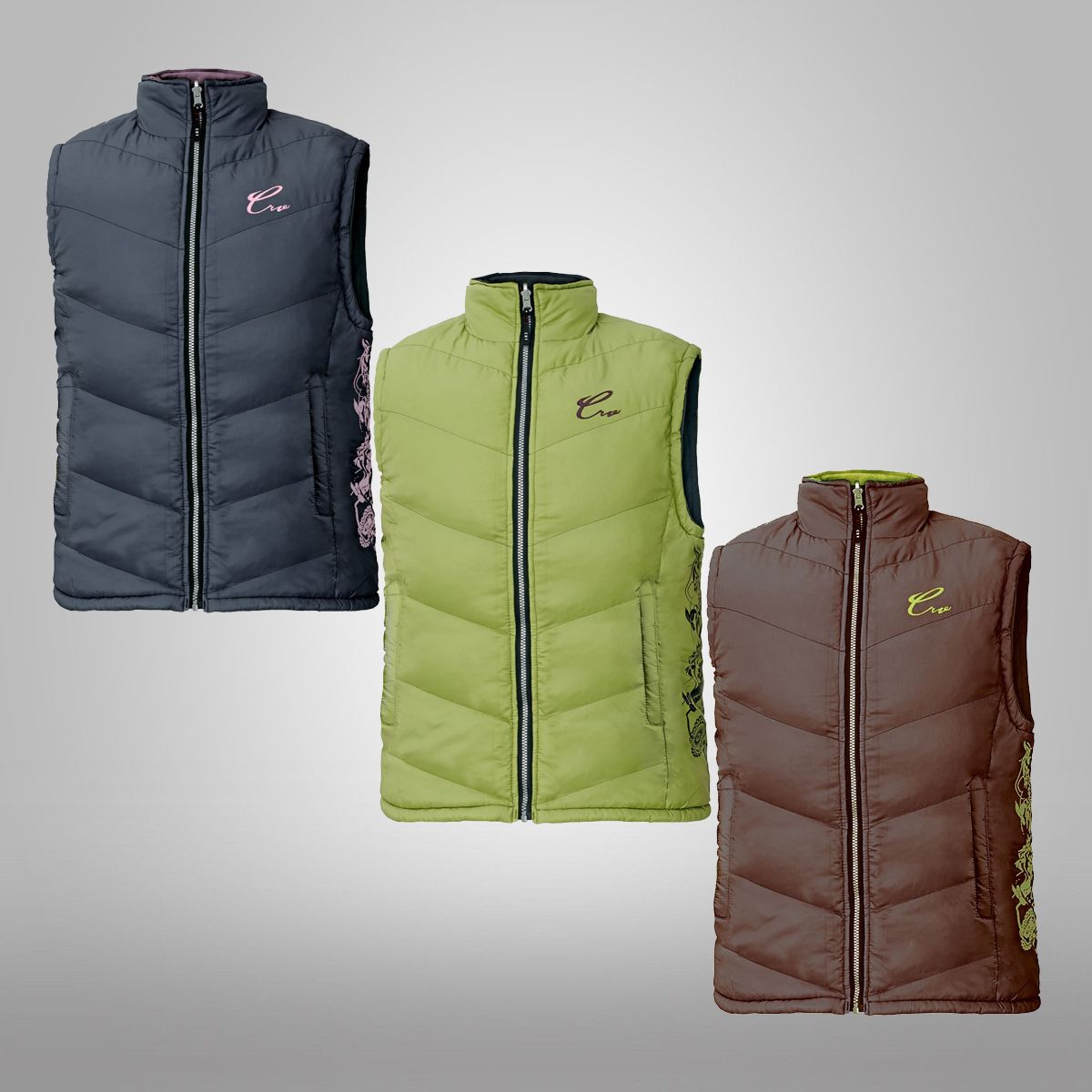 Dámská zateplená vesta se stojáčkem; zateplení polyester; vnitřní materiál polyester fleece; 2 postranní kapsy na zip; na boku dekorativní vzor kolekce YOWIE.