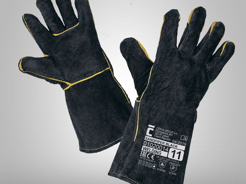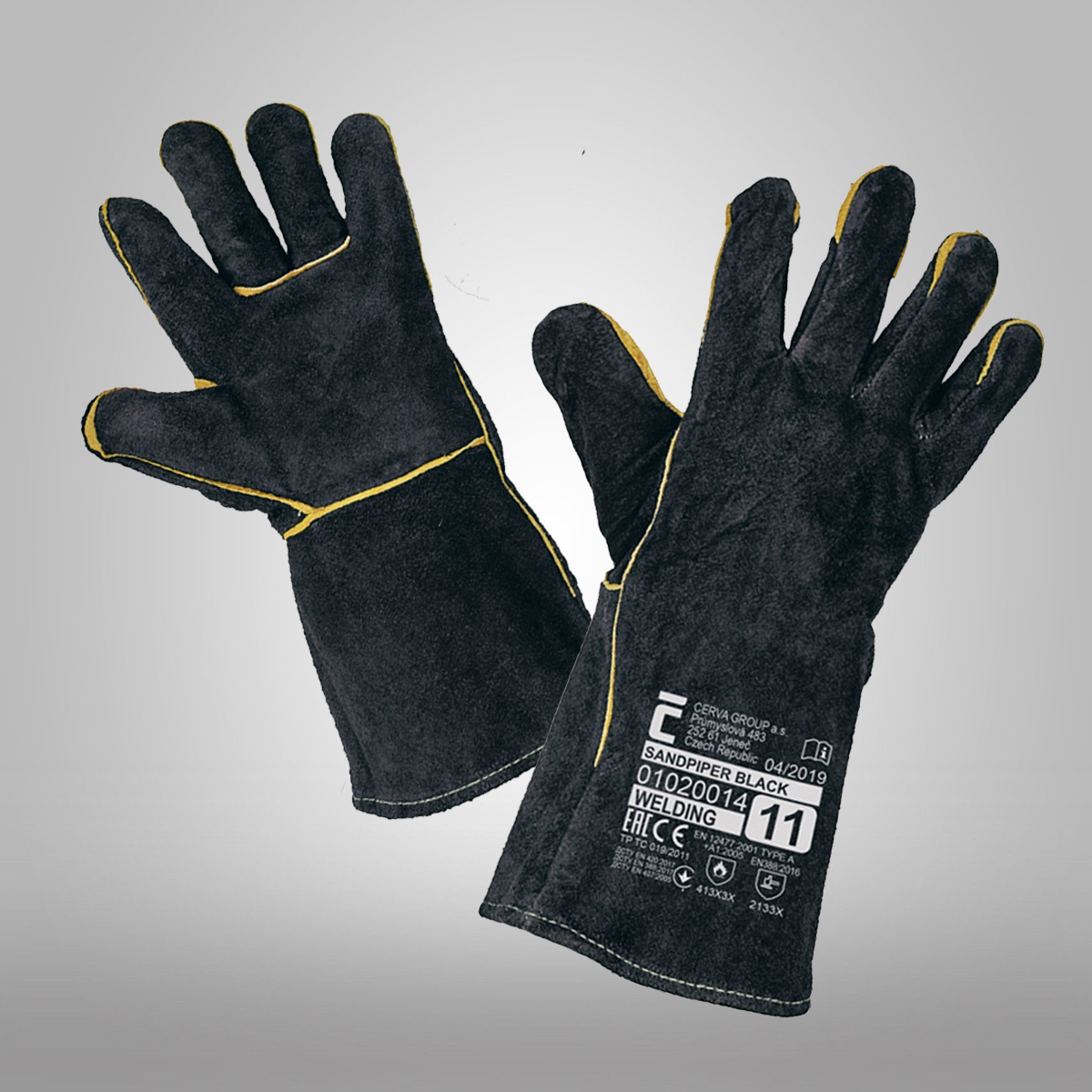 Celokožené rukavice z hovězí štípenky v délce 35 cm, s bavlněnou podšívkou a krytými švy. Certifikát: svářečské práce - typ A