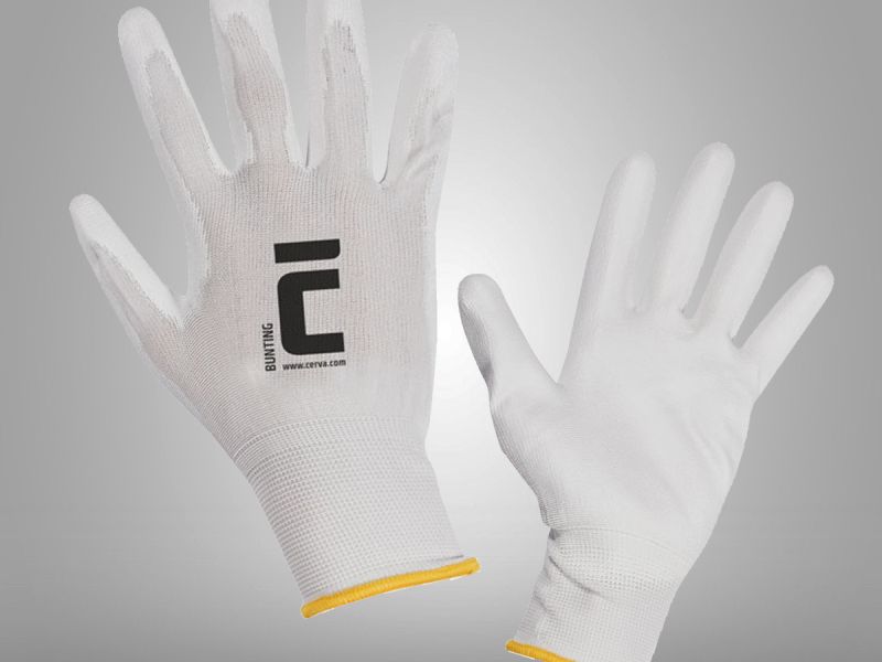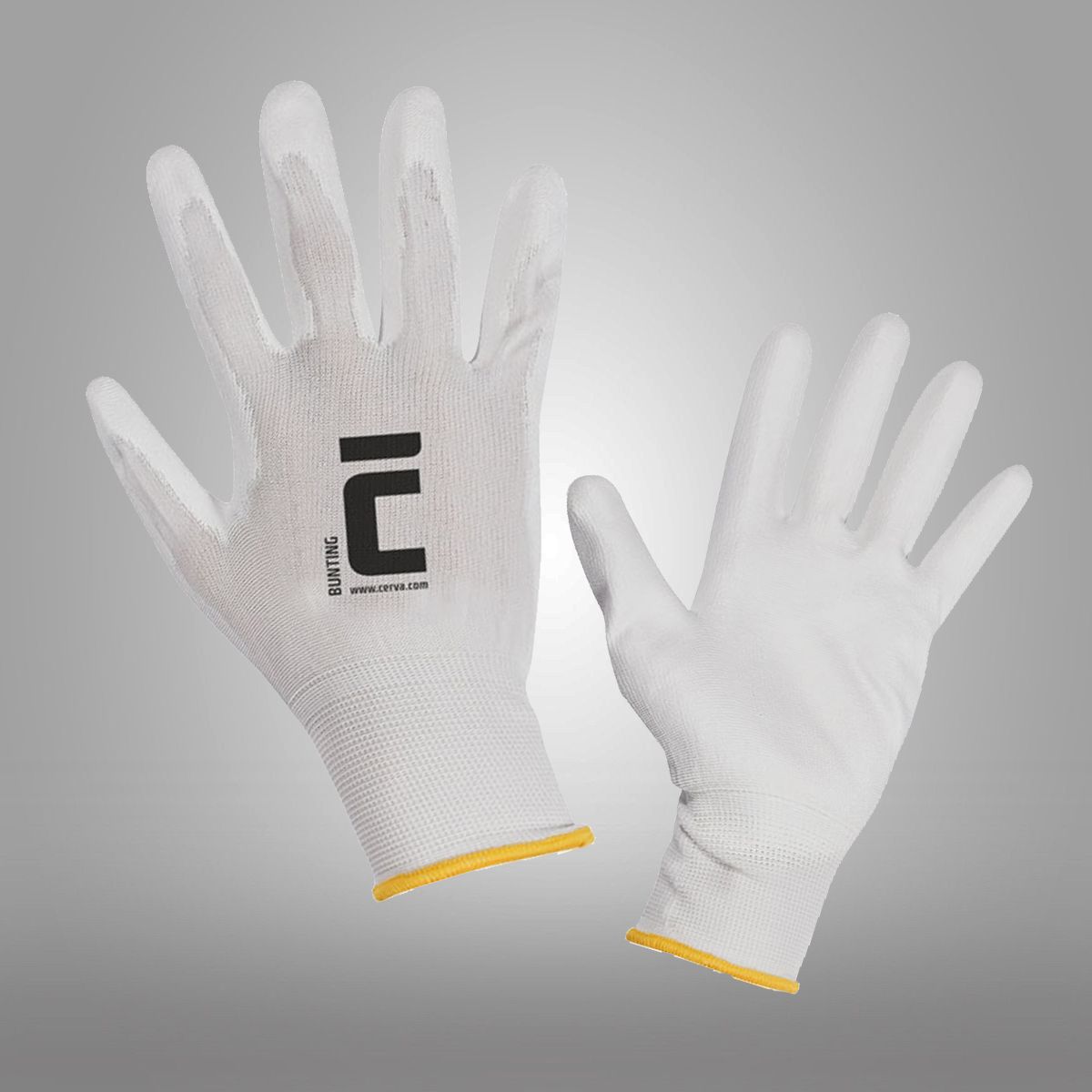 Pletené bezešvé nylonové rukavice s tenkou vrstvou polyuretanu v dlani a na prstech a pružnou manžetou.
