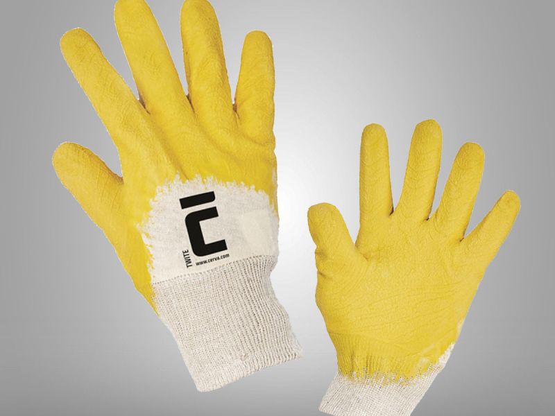 Rukavice šité z bavlny, polomáčené v přírodním latexu, s protiskluzovou úpravou v dlani a na prstech.