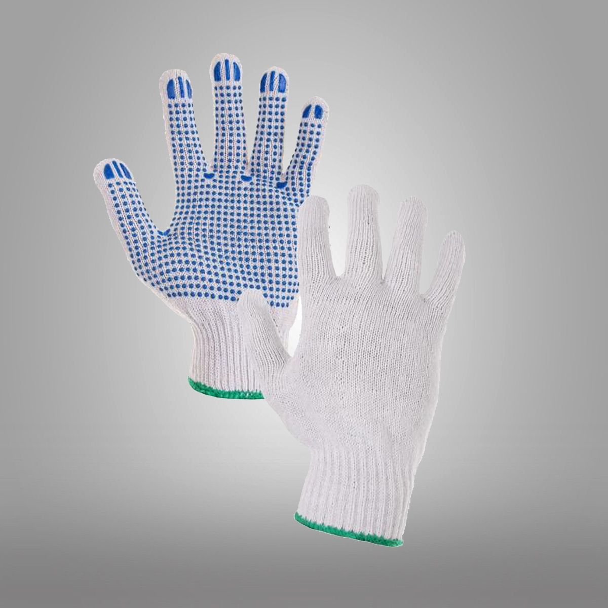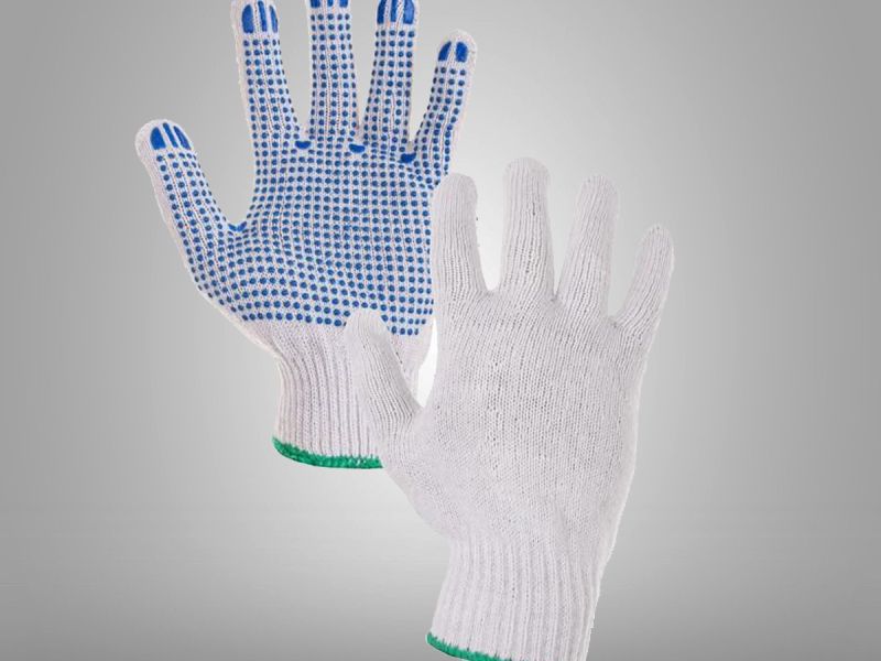 Pletené směsové rukavice s pružnou manžetou a s PVC terčíky v dlani a na prstech.