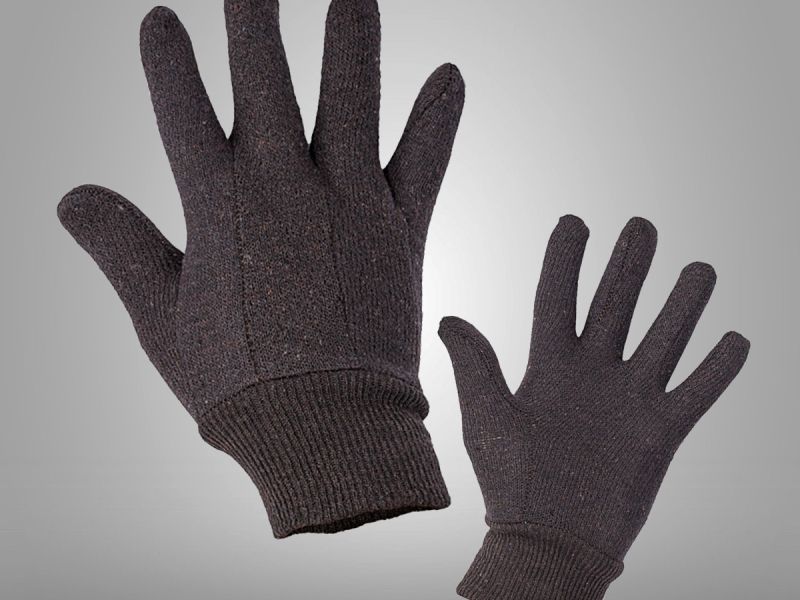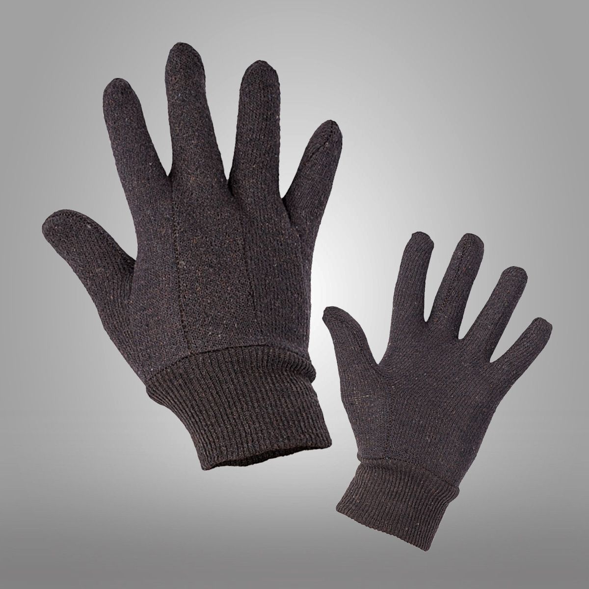 Rukavice s pružným nápletem z hnědé bavlněné teplákoviny a polyesteru.