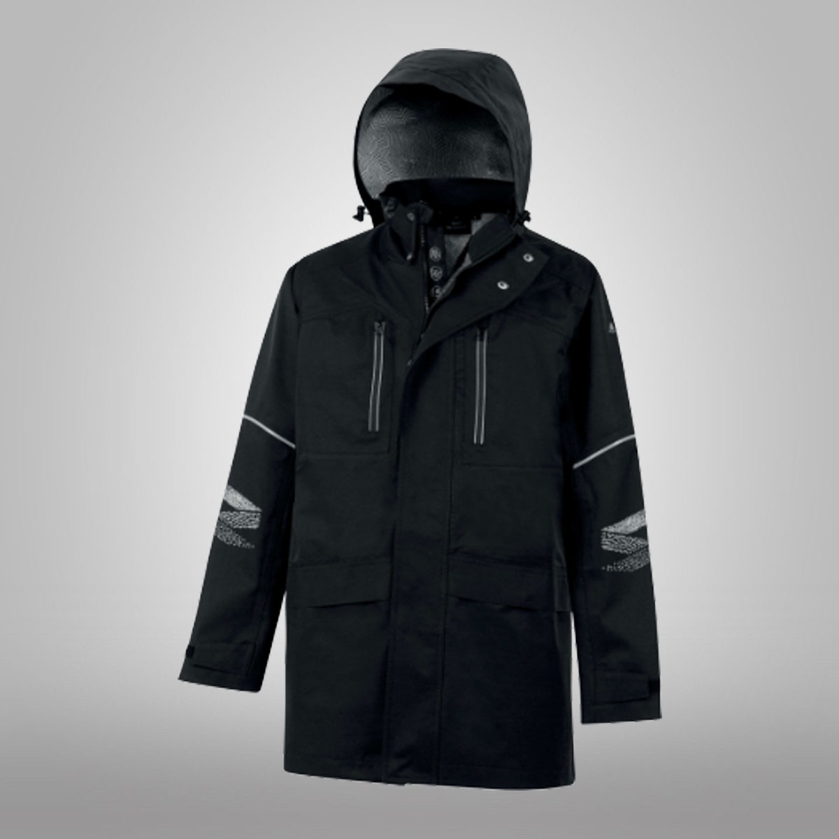 Lehká parka do deště, voděodolná a větruodolná, prodyšná s antibakteriální grafenovou membránou. HV vzor na rukávech. Odnímatelná kapuce na zip. Voděodolné švy. 4 kapsy.Materiál : Plátno - 100% recyklovaný polyester - PU grafenová membrána