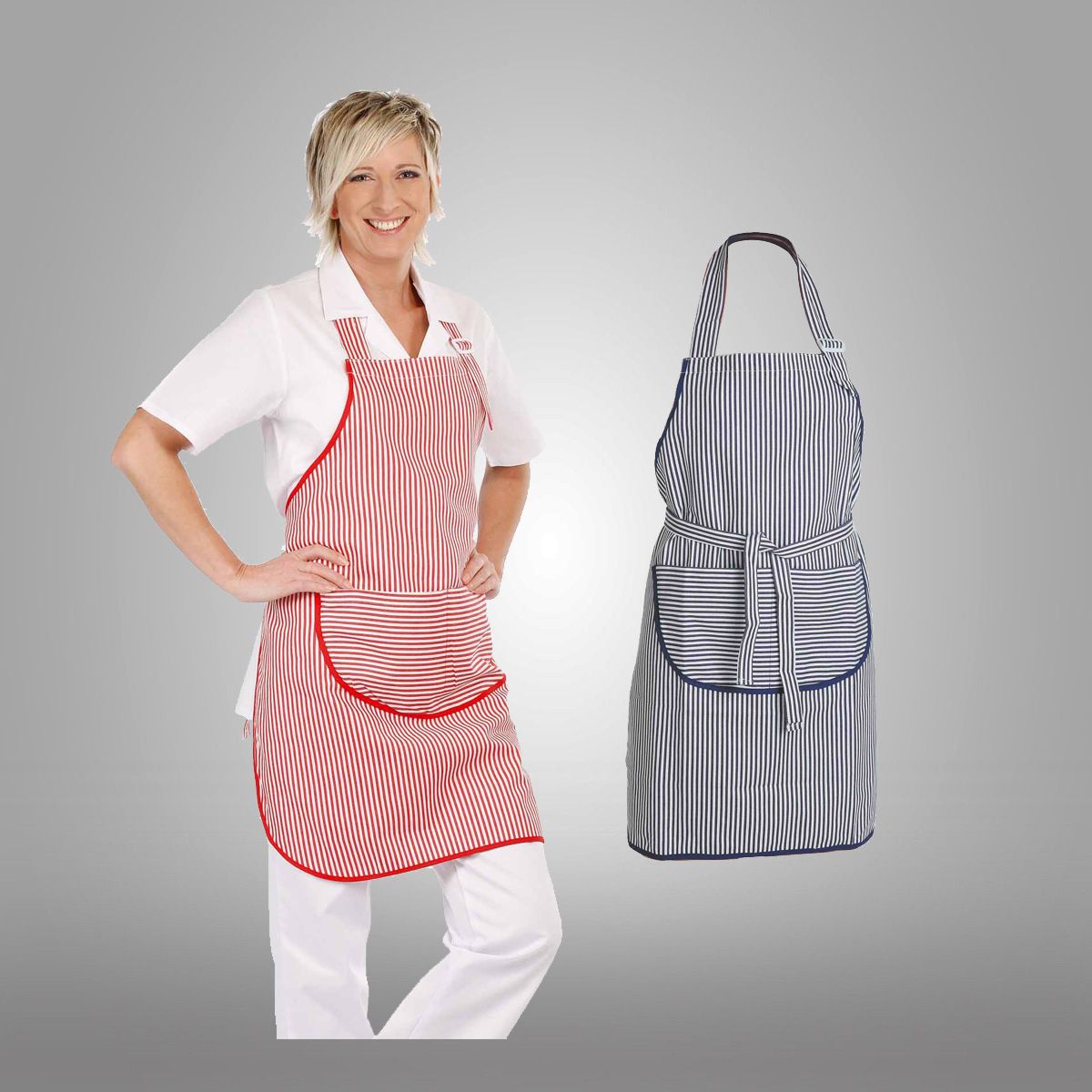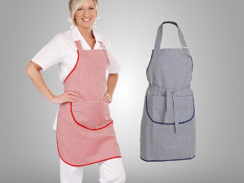 Dámská pracovní zástěra s přední dělenou kapsou; nastavitelná výška na plastovou sponu a uchycením na tkaloun.