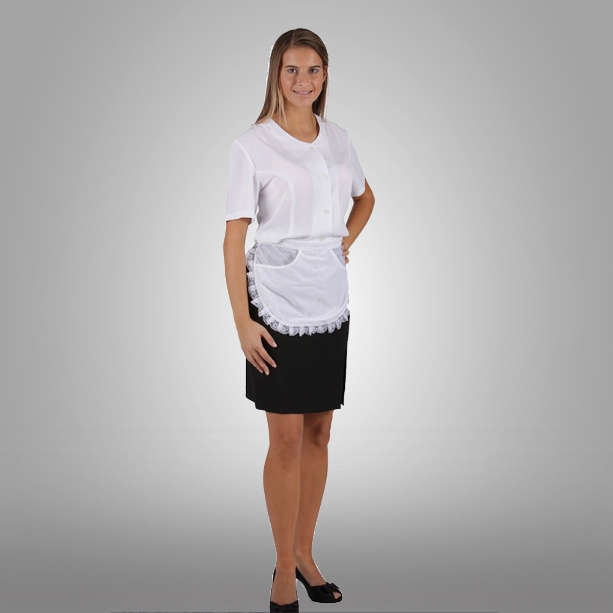 Dámská zástěrka pro servírky s bílou krajkou, 100% PAD, středová prošitá kapsa.