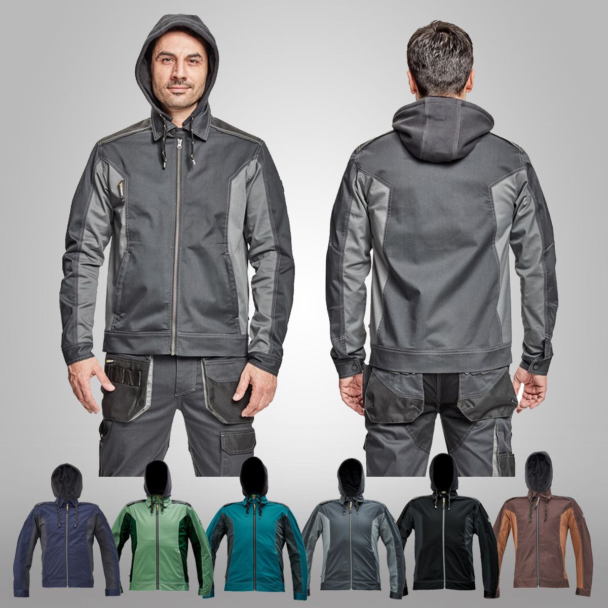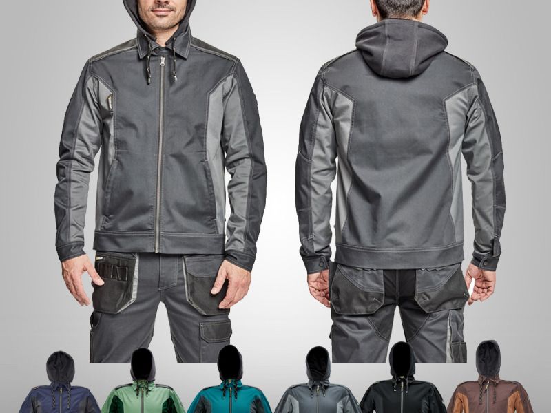 Pánská pracovní bunda, elastický inovativní materiál TRIFIBETEX®, ergonomický střih, odnímatelná kapuce, zesílená oblast ramen z materiálu Oxford, 2 boční kapsy, 1 vnitřní kapsa na telefon, reflektivní prvky v barevném odstínu