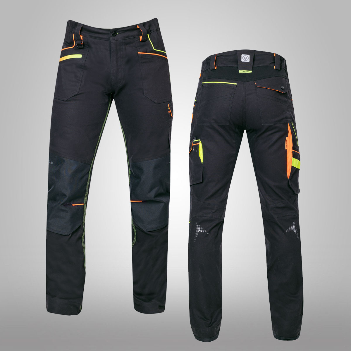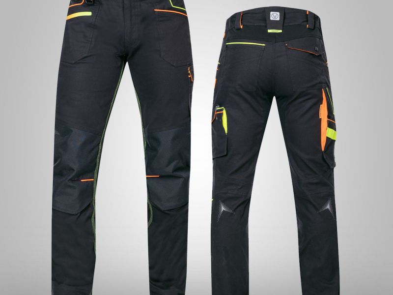Strečové bavlněné montérkové kalhoty do pasu ze speciálního materiálu Amalytton®, který vyniká zvýšenou pevností a hladkým, jemným povrchem, sníženou gramáž oceníte díky příjemnému pocitu při nošení. Na exponovaných partiích je použitý odolný a čtyřsměrně elastický materiál Tabiflex®. Kalhoty mají vysoce funkční ergonomický 3D střih SLIM FIT, který zvýrazňuje siluetu, oblast kolen je zesílená odolným materiálem Oxford s vodoodpudivou úpravou, kapsa na nákoleníky umožňuje použití výztuhy. Kalhoty jsou vybaveny pružným pasovým límcem spolu se skrytým zadním dvojitým poutkem pro pohodlné usazení opasku, vnitřní protiskluzovou páskou a D kroužkem na karabinu, 2 průhmatové kapsami, 1 přední zipová kapsa, 1 přední nářaďová kapsa se širokým poutkem, na pravé nohavici je umístěna multifunkční kapsa na skládací metr, šroubovák a odlamovací nůž se širokými poutky, na levé nohavici je velká dvojitá kapsa krytá patkou na druk, trojité prošití v namáhaných partiích. Zadní díl člení sedlo a 2 kapsy, pravá zadní kapsa je krytá patkou na druk. Spodní lem nohavic je vyztužený materiálem Oxford, který je odolný proti oděru. Zvýšenou viditelnost uživatele zajišťují dynamické reflexní 3D potisky a hi-vis doplňky. Délku nohavic lze snadno prodloužit o 5 cm