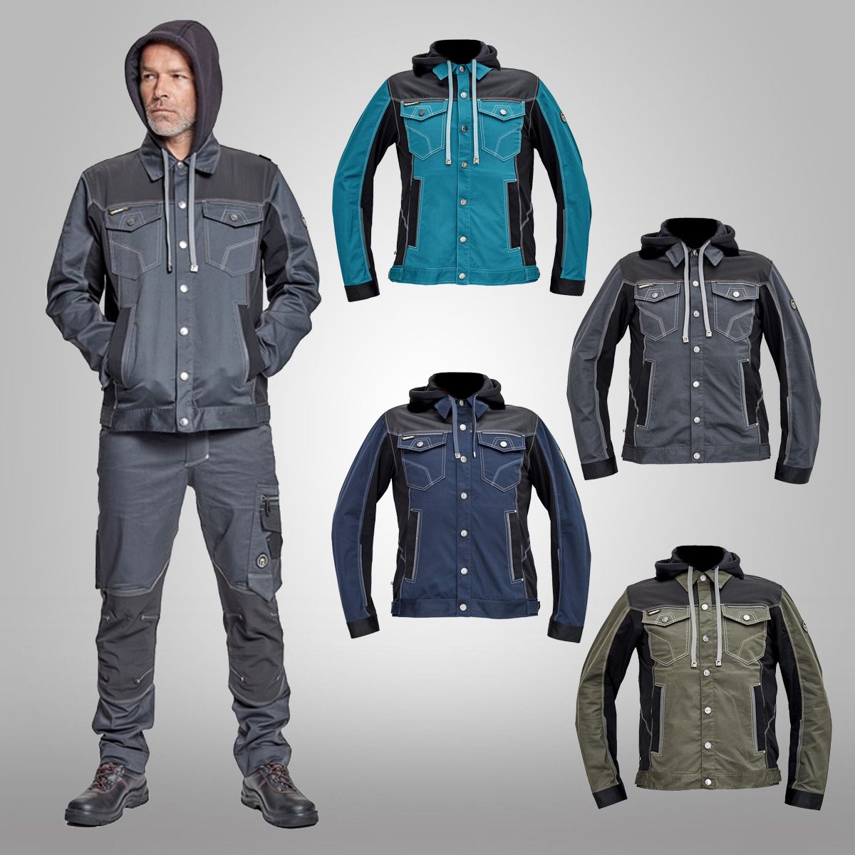 Pánská pracovní bunda se stojacím límcem, zapínáním na druky a odepínací kapucí, elastický inovativní materiál TRIFIBETEX® v kombinaci se 4way strečovým materiálem TRIFIBETEXPRO®, atraktivní design, ergonomický střih, zesílená oblast ramen z materiálu CORDURA, 2 boční kapsy, 2 náprsní kapsy na druky, nastavitelná šíře rukávů se zapínáním na druky, dekorativní trojité prošívání, reflektivní prvky v barevném odstínu.