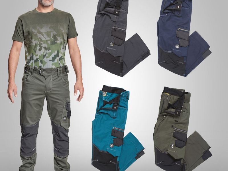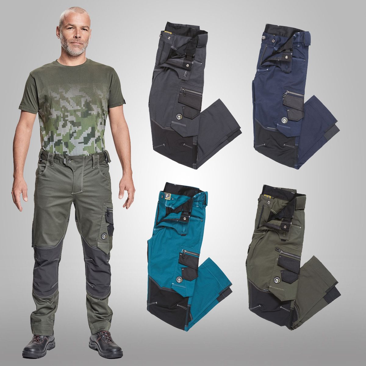 pánské pracovní kalhoty, elastický inovativní materiál TRIFIBETEX®, slim střih, snížený pružný pas, odolné trojité prošití nohavic a sedu, CORDURA zesílená oblast kolen, prostorné multifunkční přední kapsy s poutky na nářadí, 2 zadní kapsy, stehenní kapsa na telefon s klopou a zapínáním na suchý zip, kapsa na metr a nůž, poutko na kladivo, "D" kroužek, poutko na nářadí v pase, originální zpracování zapínání kalhot, reflektivní prvky v barevném odstínu, nastavitelná délka nohavic.