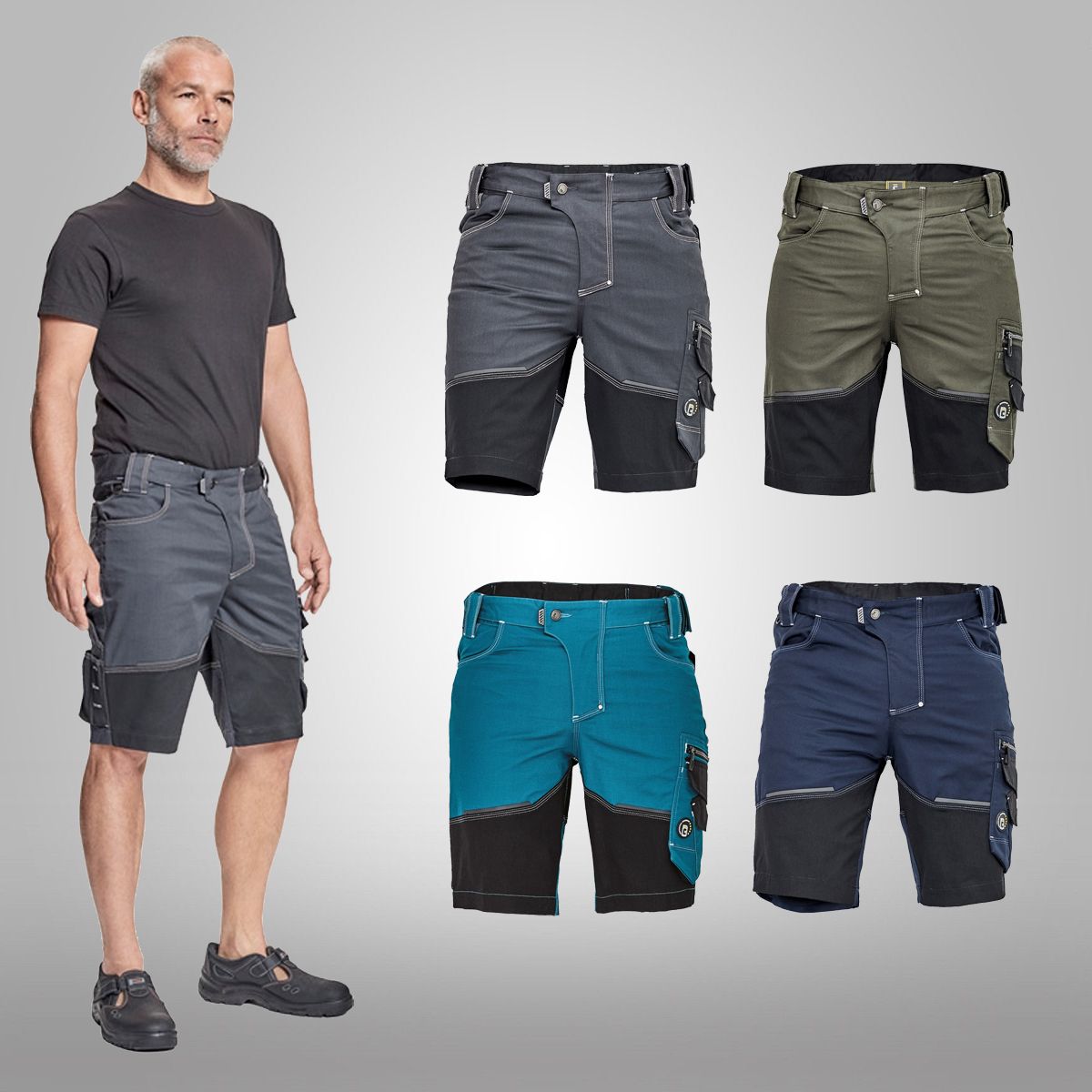 Pánské pracovní šortky, elastický inovativní materiál TRIFIBETEX®, slim střih, snížený pružný pas, odolné trojité prošití nohavic a sedu, prostorné multifunkční přední kapsy s poutky na nářadí, 2 zadní kapsy na suchý zip, stehenní kapsa na telefon s klopou a zapínáním na suchý zip, kapsa na metr a nůž, poutko na kladivo, "D" kroužek, poutko na nářadí v pase, originální zpracování zapínání kalhot, reflektivní prvky v barevném odstínu.
