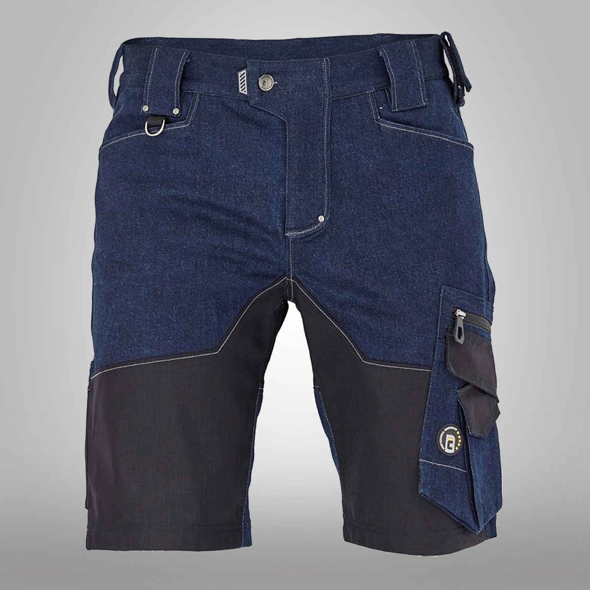 Pánské pracovní šortky, elastická předepraná denim látka, slim střih, snížený pružný pas, odolné trojité prošití nohavic a sedu, CORDURA a TRIFIBETEX zesílená část stehen a sedu, prostorné multifunkční přední kapsy s poutky na nářadí, 2 zadní kapsy, stehenní kapsa na telefon s klopou a zapínáním na suchý zip, kapsa na metr a nůž, poutko na kladivo, "D" kroužek, poutko na nářadí v pase, originální zpracování zapínání kalhot.