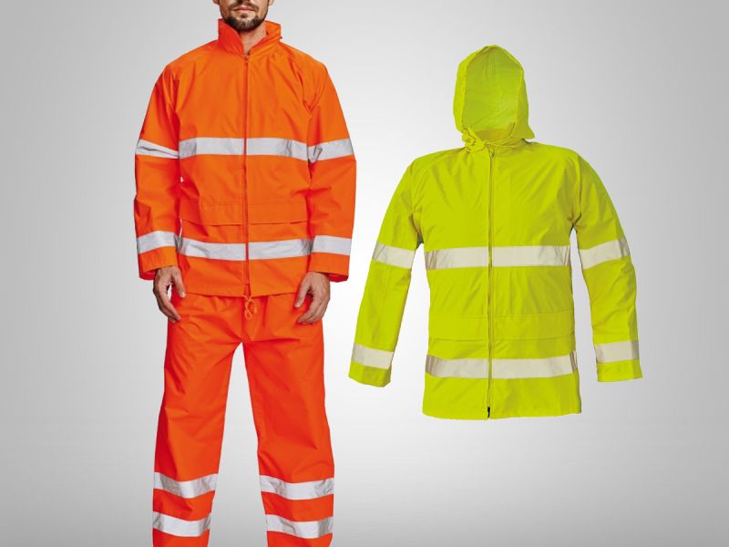 Výstražná Hi-Vis nepromokavá lehká bunda s kapucí a reflexními pruhy • integrovaná kapuce v límci • spodní lem ke stažení na tkaničku • odvětrávání bundy na zádech a v podpaží • podlepené švy