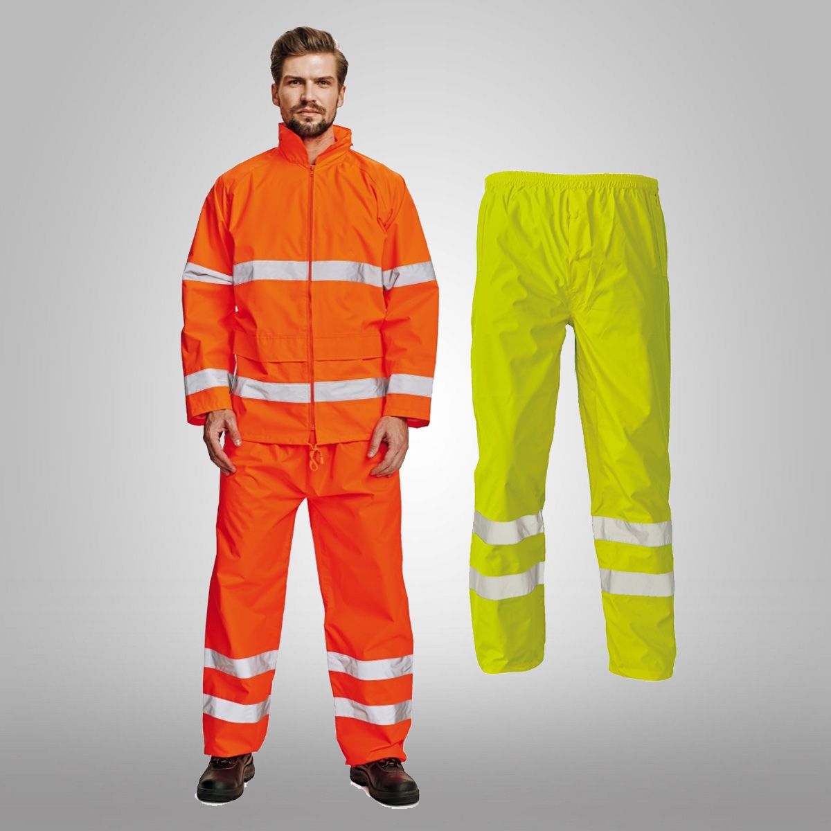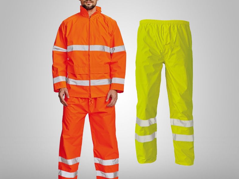 Výstražné Hi-Vis nepromokavé kalhoty s reflexními pruhy • v pase pruženka na gumu • spodní lem nohavic ke stažení na plastové druky • podlepené švy