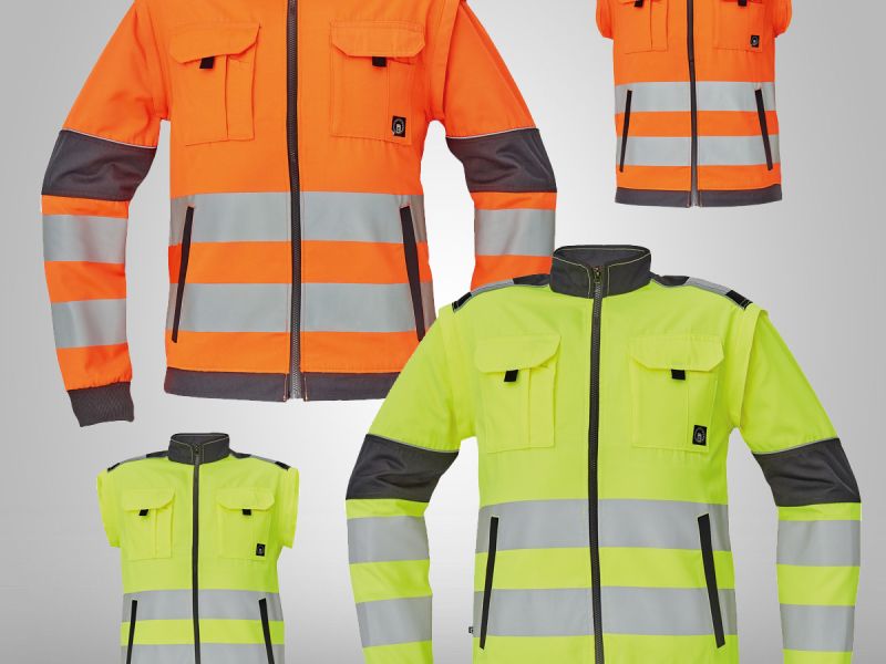 Pánská HI-VIS pracovní bunda se zapínáním na zip, odepínatelné rukávy, 2 přední kapsy, 2 náprsní kapsy, Oxford 600D zesílení namáhaných míst loktů a ramen, dvojice tištěných 7 cm reflexních pruhů přes obvod pasu a rukávů, 2 menší pruhy přes ramena, reflexní paspulky lemující zesílené části rukávů a ramen, pružné náplety manžet rukávů a elastický spodní obvod pasu.