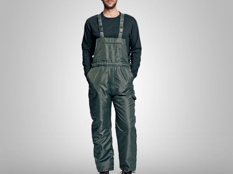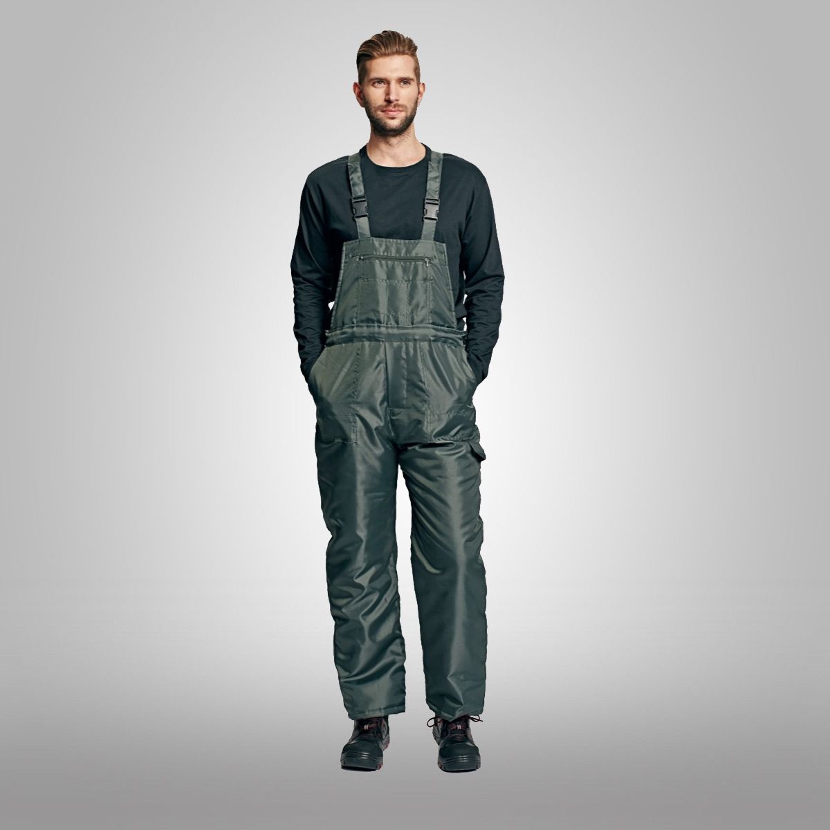 Pánské zateplené zimní kalhoty s laclem, větru a voděodolné; 3 funkční kapsy; boční zapínání na knoflíky; nastavitelné šle s přezkami. Barva modrá.