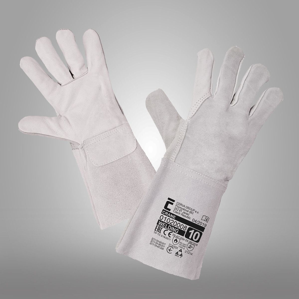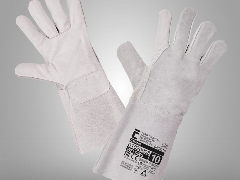 Celokožené rukavice z lícové hověziny v dlani, hovězí štípenky na hřbetu, s tuhou 15 cm širokou manžetou, bez podšívky. Certifikát: svářečské práce - typ B