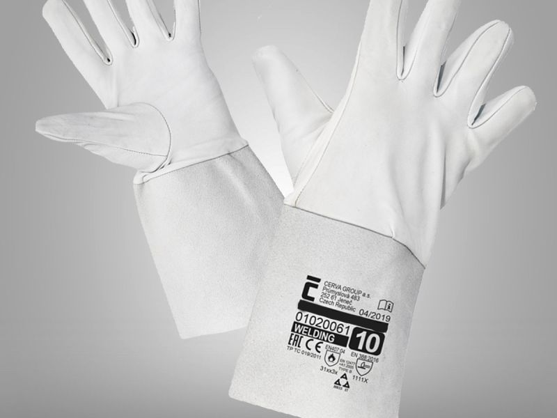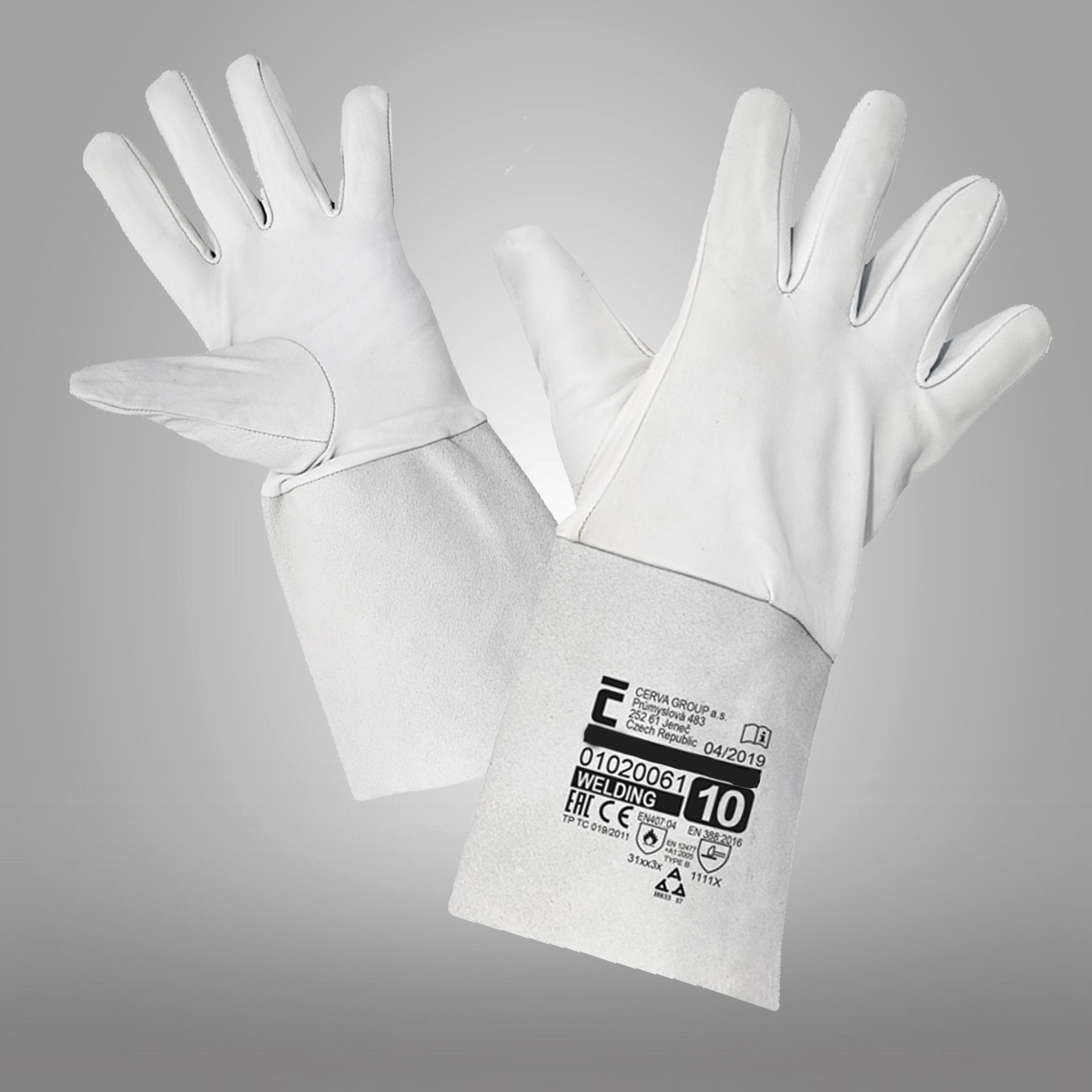 Celokožené rukavice z lícové kozinky s 15 cm širokou manžetou z hovězí štípenky. Certifikát: svářečské práce - typ B