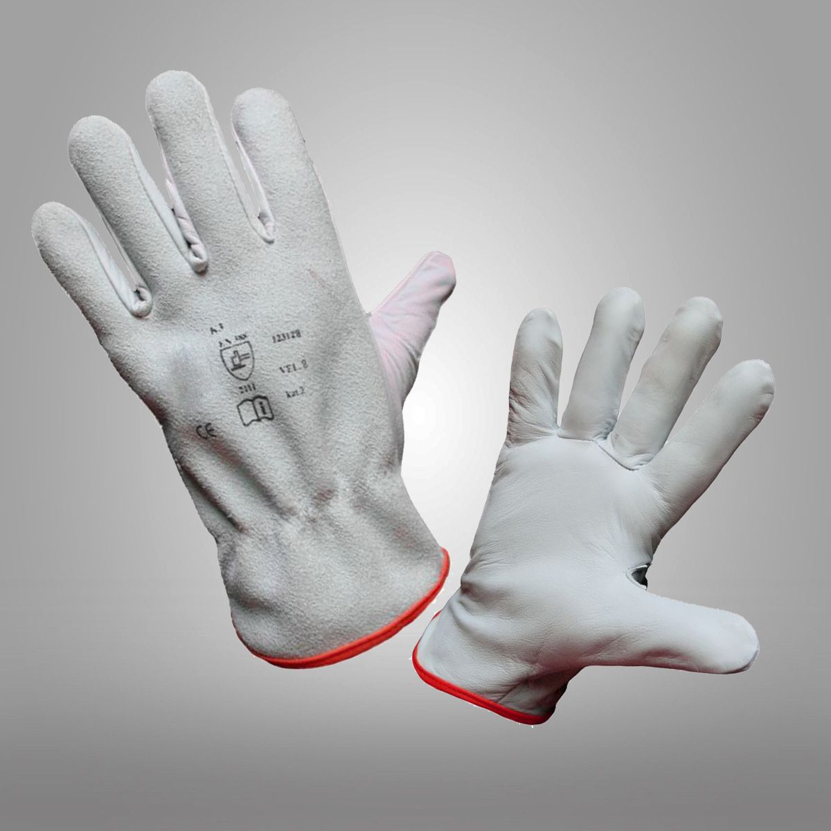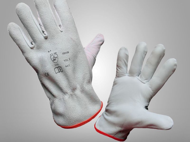 Rukavice z jemné bílé lícové koziny se štípanou hovězinou na hřbetní straně. Střih driver. Pruženka na zápěstí. Barevný bavlněný lem pro odlišení velikostí.