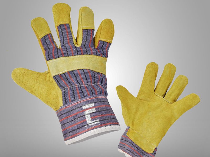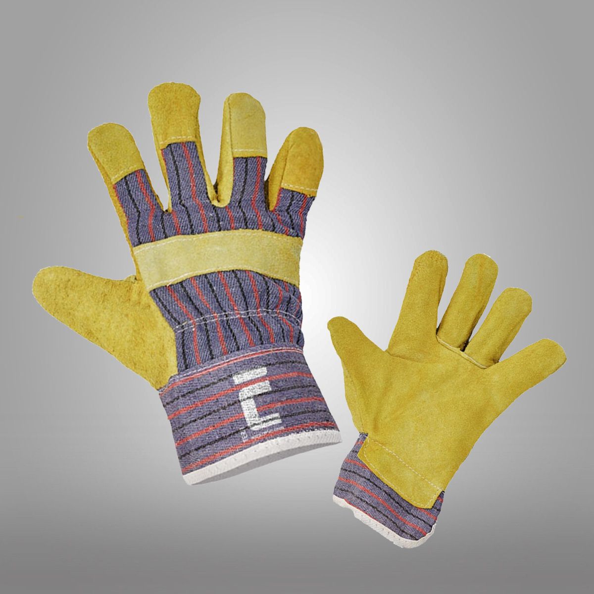 Rukavice z hovězí štípenky v dlani s podšívkou, hřbet a manžeta z bavlněné tkaniny.