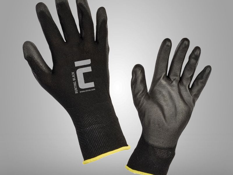 Pletené bezešvé nylonové rukavice, s tenkou vrstvou polyuretanu v dlani a na prstech a pružnou manžetou.