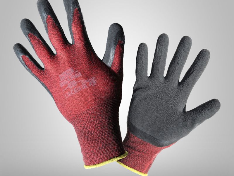 Bezešvé jemně pletené rukavice (úplet 13G), materiál: 100% spandex, polomáčené v černém pěnovém latexu, EN ISO 21420:2020