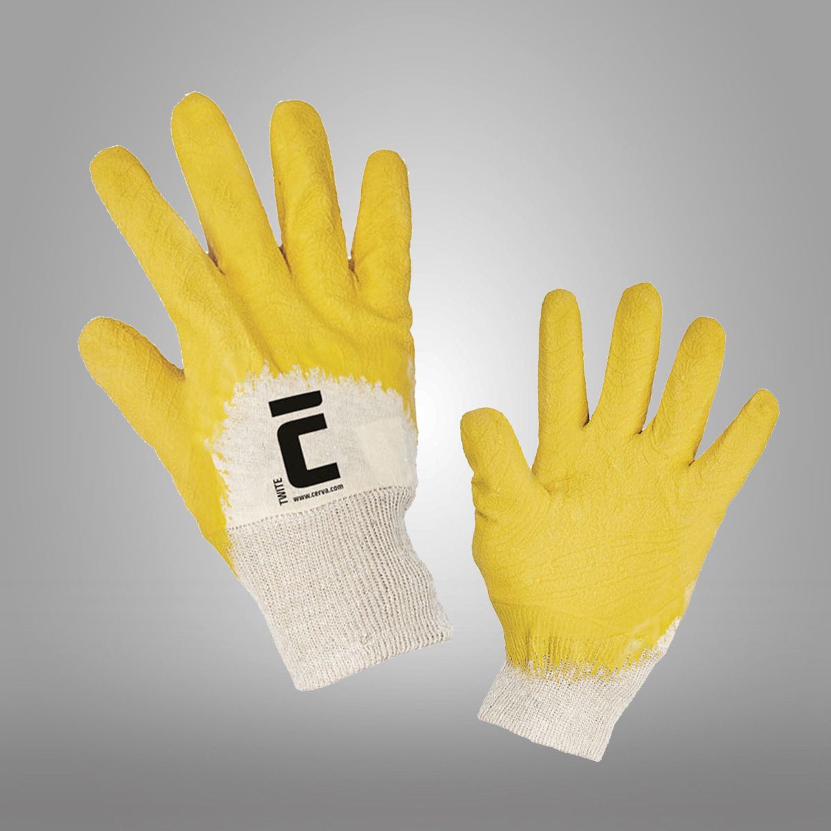 Rukavice šité z bavlny, polomáčené v přírodním latexu, s protiskluzovou úpravou v dlani a na prstech.