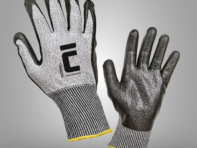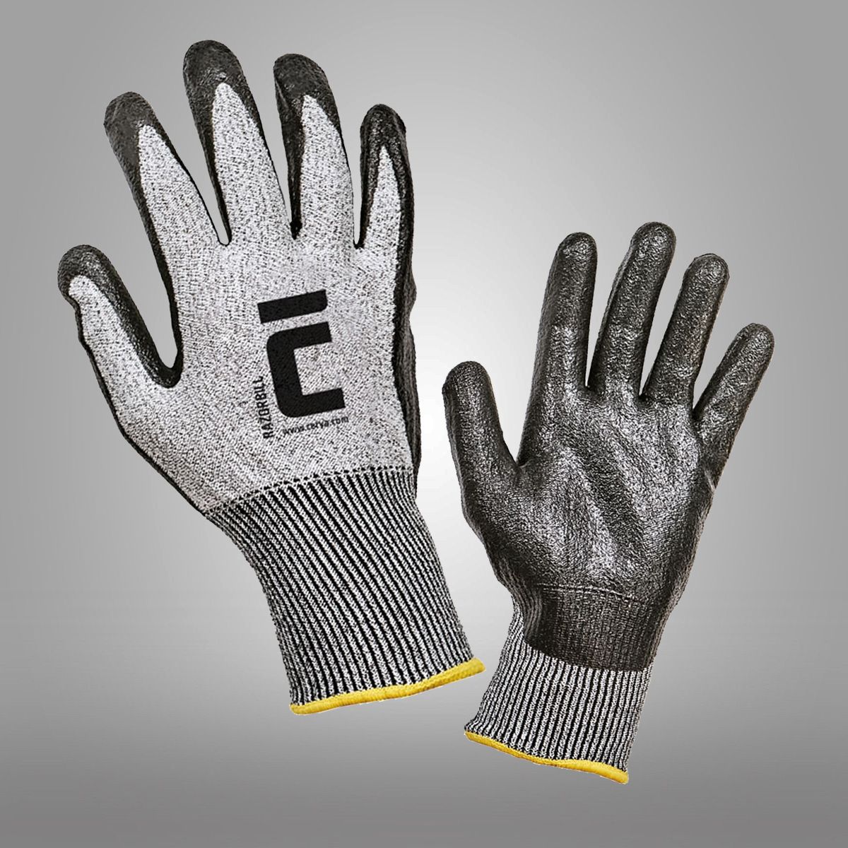 Pletené bezešvé rukavice z modifikovaného skleněného vlákna, Spandexu a nylonu, s nánosem HCT nitrilu v dlani a na prstech a odolností proti prořezu tř. C.