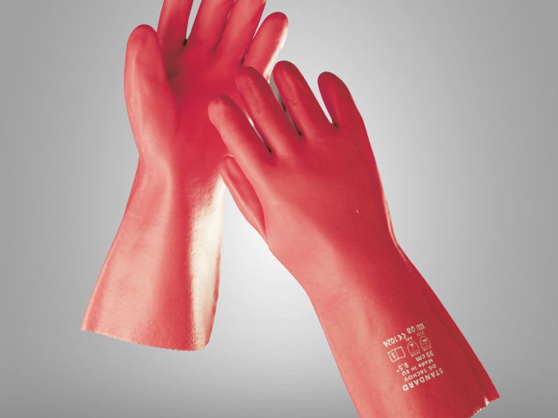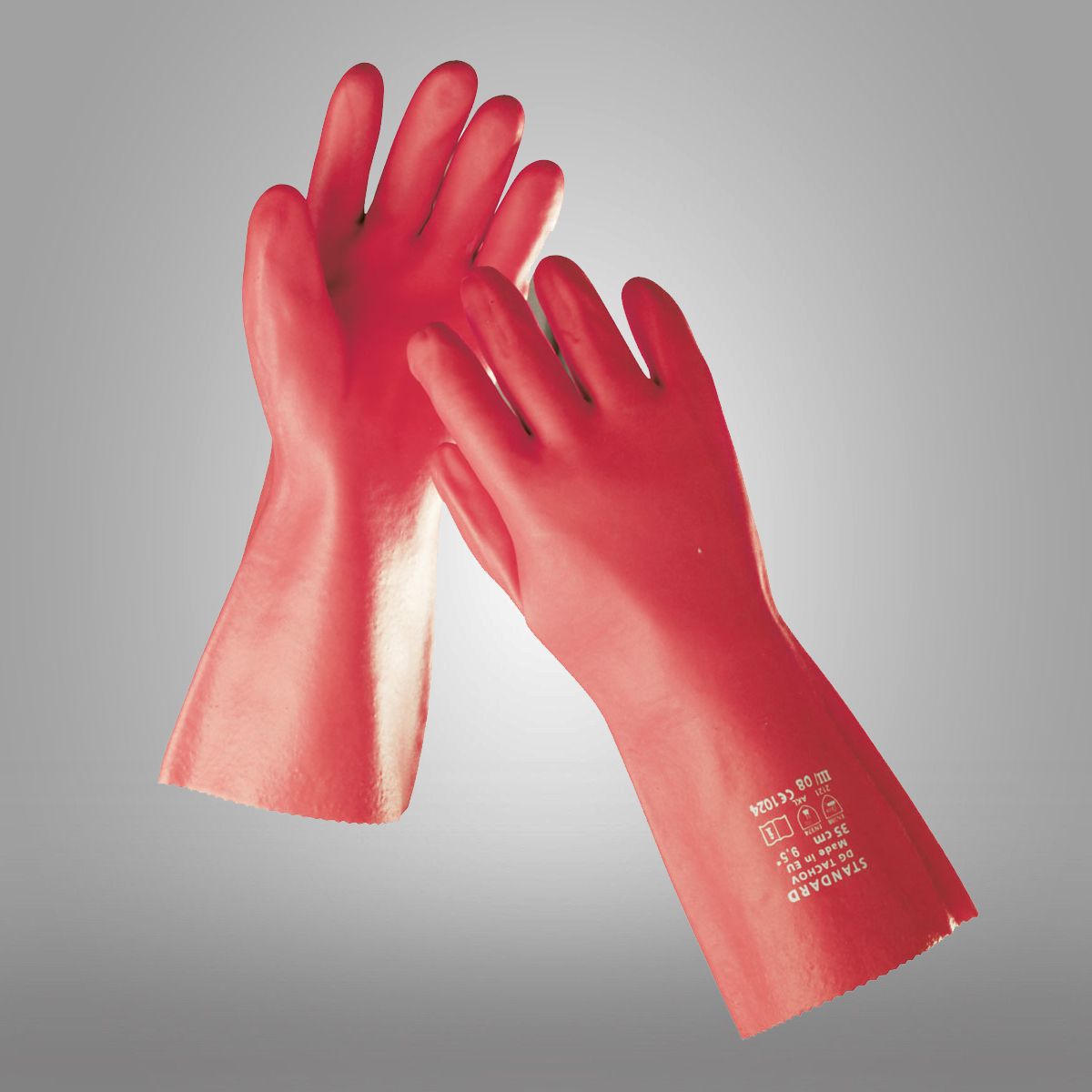 Šitý bavlněný úplet máčený v PVC, odolné mechanickým a chemickým rizikům.