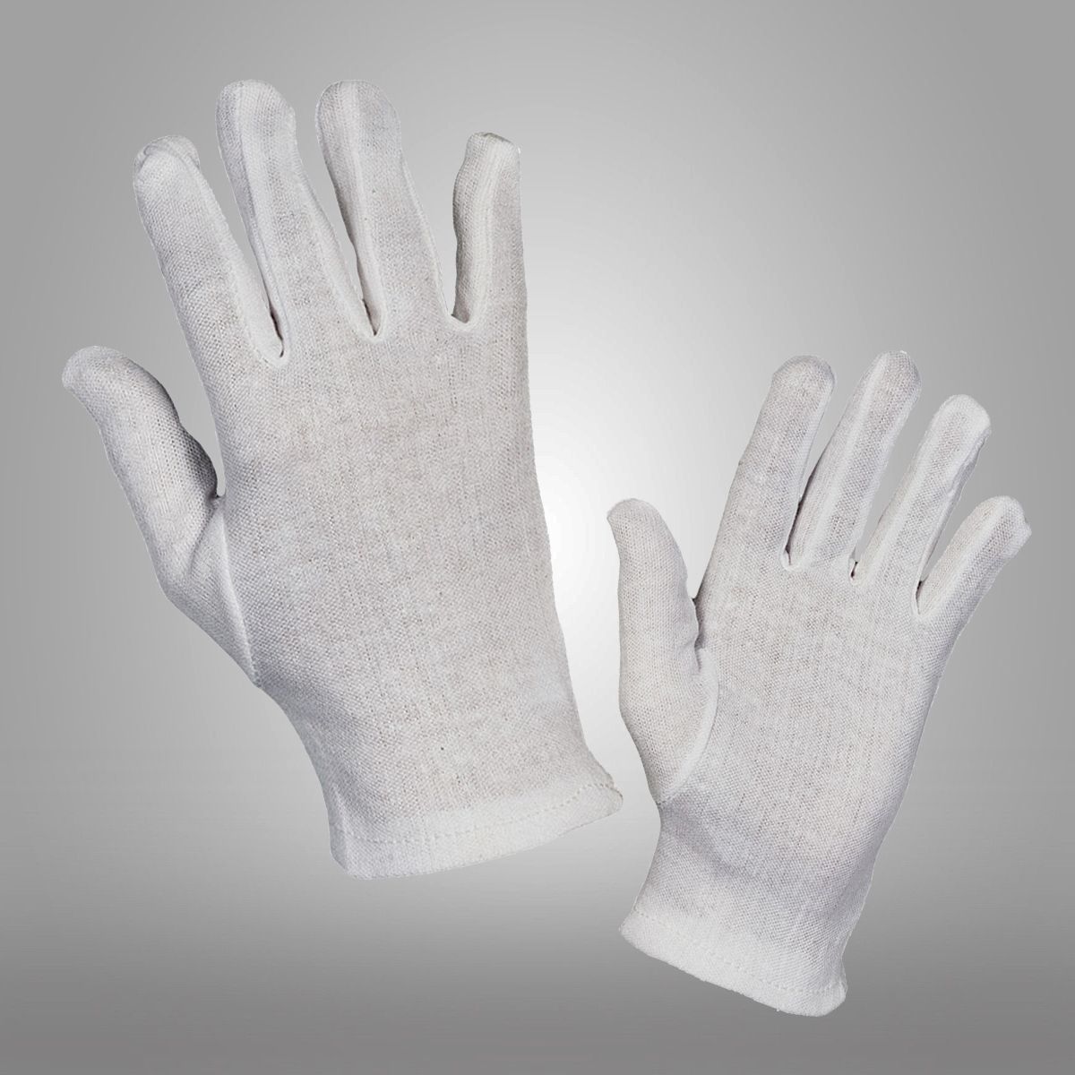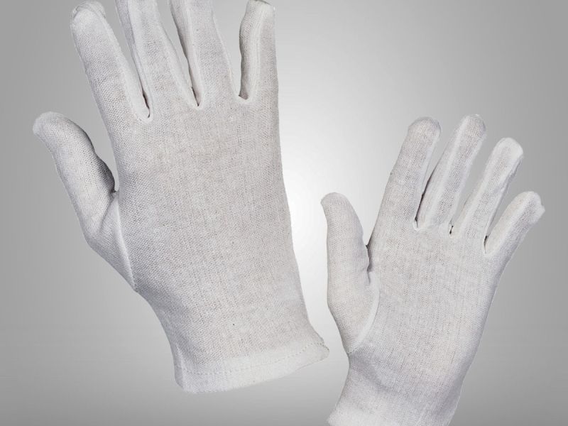 Rukavice bez manžety šité z jemného běleného úpletu podle střihu fourchette z bavlny a polyesteru.